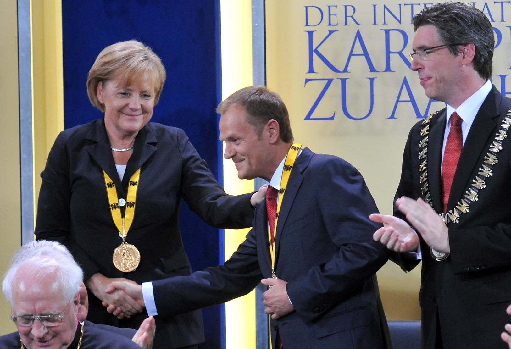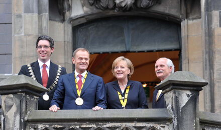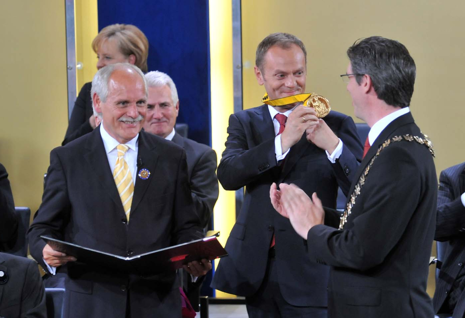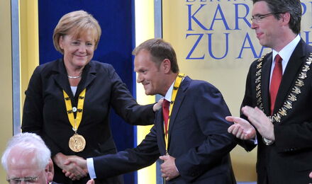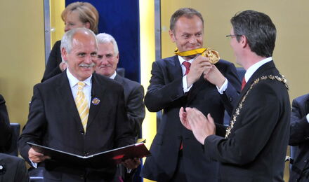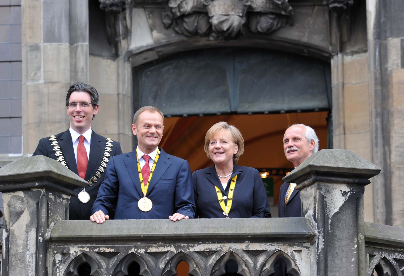 Mit dem Premierminister der Republik Polen Donald Tusk ehrt das Direktorium der Gesellschaft für die Verleihung des Internationalen Karlspreises zu Aachen im Jahre 2010 einen herausragenden Streiter für Freiheit, Demokratie und Menschenrechte, der sich dem kommunistischen Regime niemals gebeugt hat; einen überzeugten und überzeugenden Europäer, der insbesondere die junge Generation für Europa begeistern kann, der für Verständigung, Zusammenarbeit, Solidarität und ein weltoffenes Polen steht, das fest in der Europäischen Völkerfamilie verankert und in das Herz Europas zurückgekehrt ist.