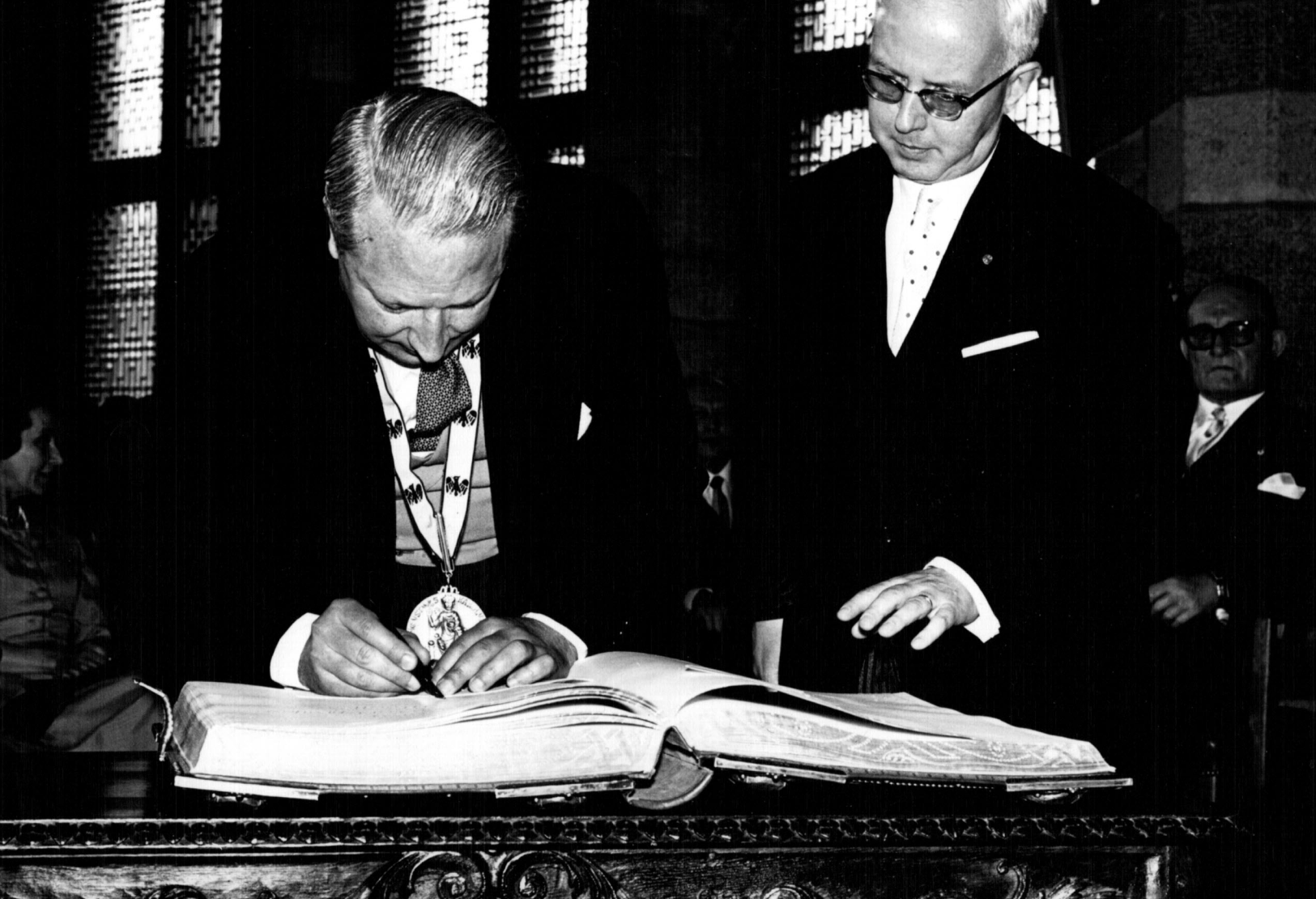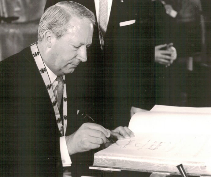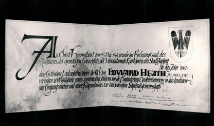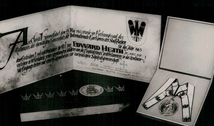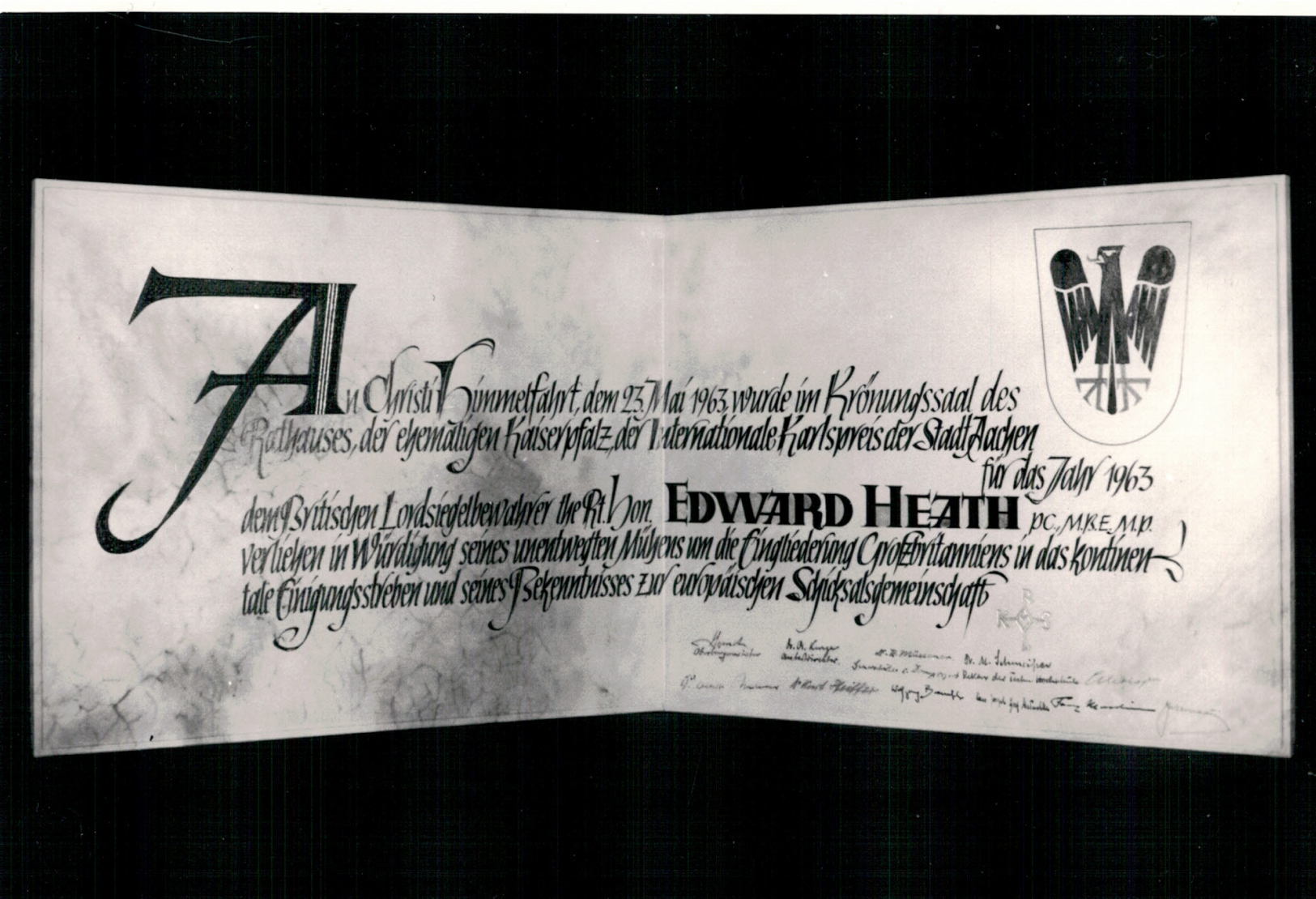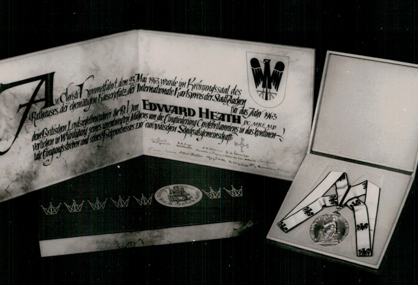 An Christi Himmelfahrt, dem 23. Mai 1963, wurde im Krönungssaal des Rathauses, der ehemaligen Kaiserpfalz, der Internationale Karlspreis der Stadt Aachen für das Jahr 1963 dem Britischen Lordsiegelbewahrer The Rt. Hon. Edward Heath PC., M.B.E. M.P. verliehen in Würdigung seines unentwegten Mühens um die Eingliederung Großbritanniens in das kontinentale Einigungsstreben und seines Bekenntnisses zur europäischen Schicksalsgemeinschaft.