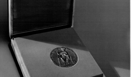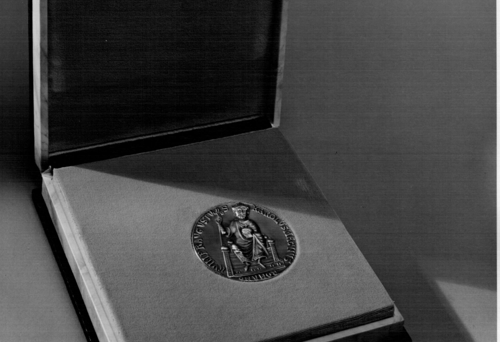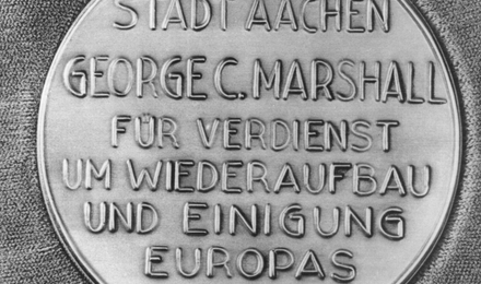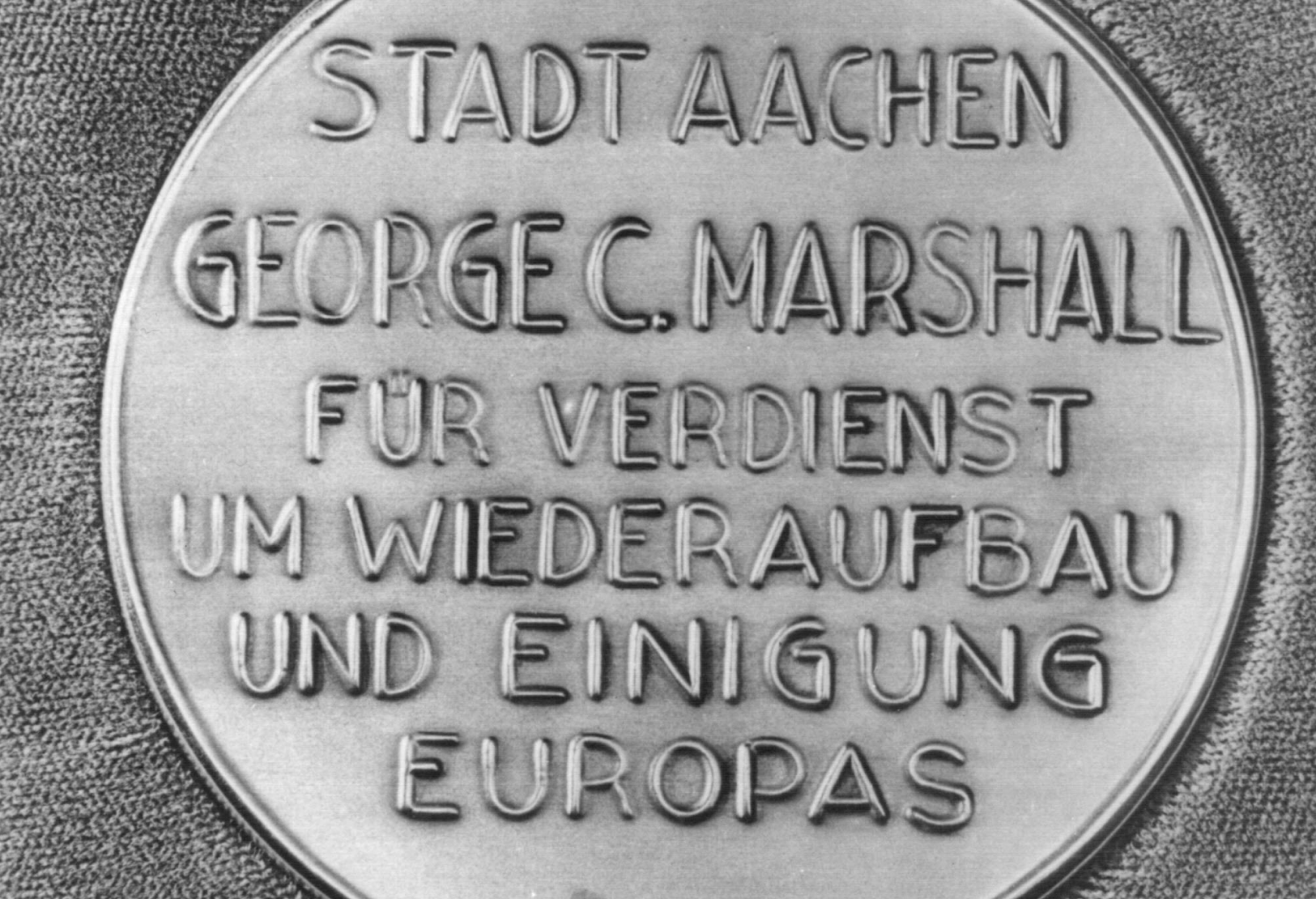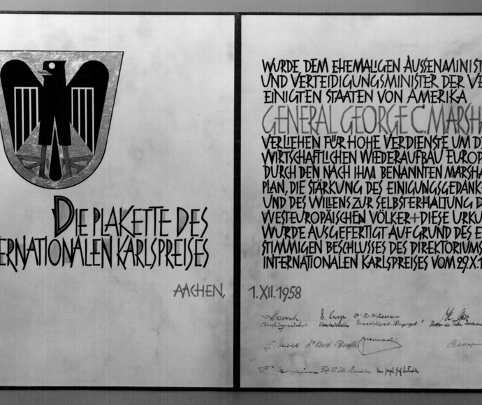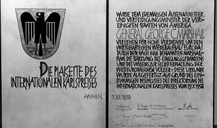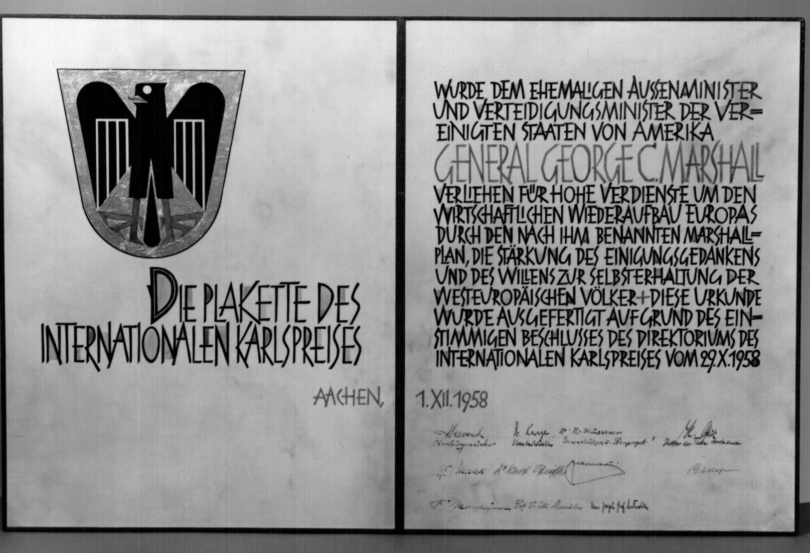 Die Plakette des Internationalen Karlspreises wurde dem ehemaligen Außenminister und Verteidigungsminister der Vereinigten Staaten von Amerika General George C. Marshall verliehen für hohe Verdienste um den wirtschaftlichen Wiederaufbau Europas durch den nach ihm benannten Marshallplan, die Stärkung des Einigungsgedankens und des Willens zur Selbsterhaltung der westeuropäischen Völker. Diese Urkunde wurde ausgefertigt aufgrund des einstimmigen Beschlusses des Direktoriums des Internationalen Karlspreises am 29.10.1958.