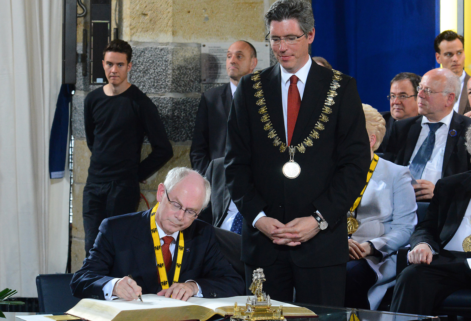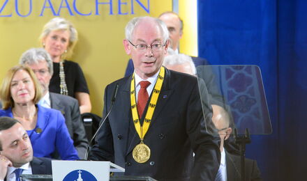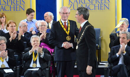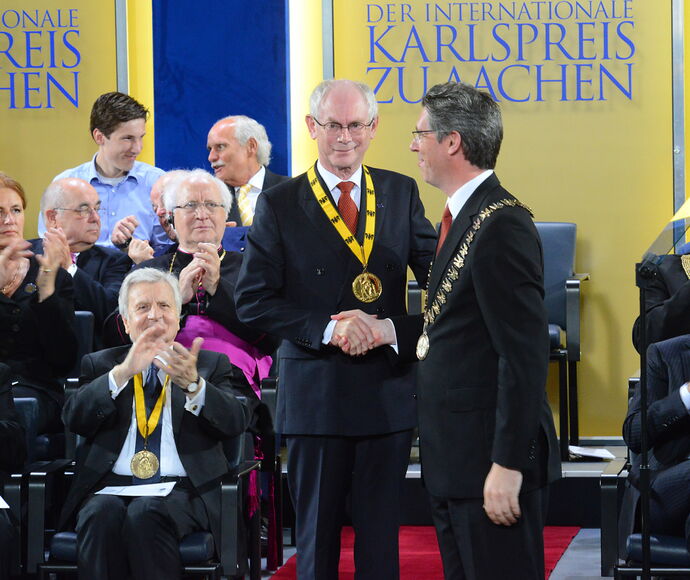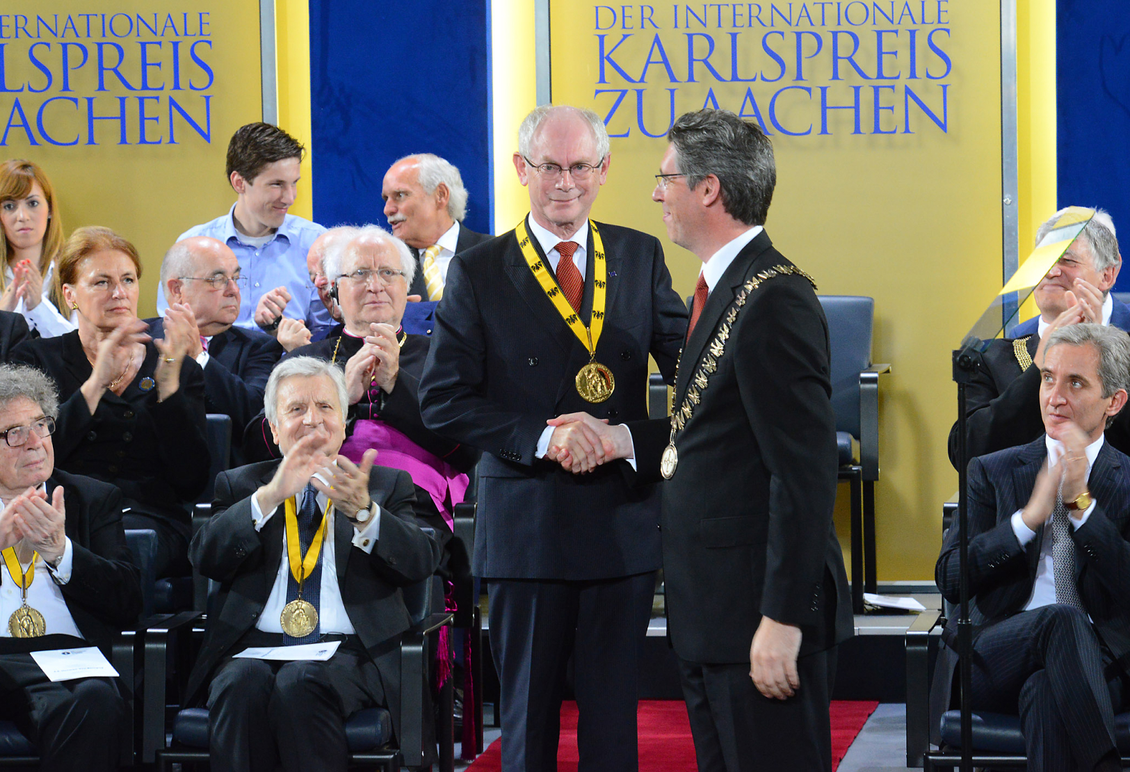 Mit dem Präsidenten des Europäischen Rates Herman Van Rompuy ehrt das Direktorium der Gesellschaft für die Verleihung des Internationalen Karlspreises zu Aachen im Jahr 2014 einen großen Europäer, der als unermüdlicher Arbeiter, Mittler und Konsensbildner in schwerer Zeit einen bedeutenden Beitrag zur Konsolidierung der EU geleistet hat und der als wichtiger Impuls- und Ideengeber Orientierung dafür gibt, welchen Weg das Europa von morgen nehmen soll.