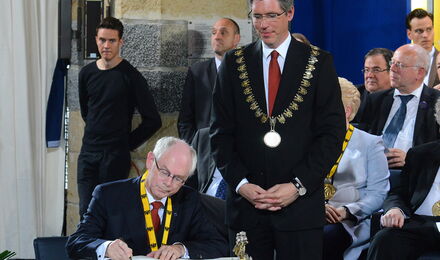 Hatten sich die europäischen Staats- und Regierungschefs lange Zeit lediglich zu zeremoniellen Anlässen versammelt, wurde 1974 – vor knapp vier Jahrzehnten – vereinbart, die Treffen unter der Bezeichnung „Europäischer Rat“ fortan regelmäßig durchzuführen, und schon bald entwickelte sich der Rat zur wichtigsten Institution, wenn es um die allgemeinen politischen Zielvorstellungen und Prioritäten der EU geht. Indes sollte es 35 Jahre dauern, bis der Rat mit Inkrafttreten des Lissabonner Vertrags am 1. Dezember 2009 zu einem der inzwischen sieben offiziellen Organe der EU wurde. Mit der gleichzeitigen Einrichtung eines permanenten Vorsitzes im Europäischen Rat sollte dem durch die jeweils halbjährlichen Ratspräsidentschaften bedingten dauernden Personalwechsel an der Spitze Europas entgegengewirkt werden, Kontinuität in die Arbeit des Rates Einzug halten und dem Vereinten Europa gegenüber den Partnern in der Welt ein Gesicht gegeben werden. Als erster ständiger Präsident hat Herman Van Rompuy dieses Amt von Beginn an geprägt und wurde so in den zurückliegenden vier Jahren zu einem der entscheidenden Krisenmanager und Ideengeber Europas.Herman Van Rompuy wurde am 31. Oktober 1947 in der Brüsseler Gemeinde Etterbeek geboren. Nach Abschluss seiner Studien der Philosophie (Bachelor 1968) und der Betriebswirtschaftslehre (Master 1971) an der Katholischen Universität Leuven trat er zunächst in den Dienst der Belgischen Nationalbank, bevor er 1975 als Berater im Kabinett des damaligen Premierministers und späteren Karlspreisträgers Leo Tindemans erstmals für die belgische Regierung tätig wurde; 1978 wechselte er in das Kabinett von Finanzminister Gaston Geens. Von 1980 bis 1988 leitete er das Zentrum für politische, ökonomische und soziale Studien; zudem nahm er Lehraufträge an der Handelshochschule Antwerpen (1980-1987) und an der Vlaamse Economische Hogeschool in Brüssel (1982-2008) wahr.