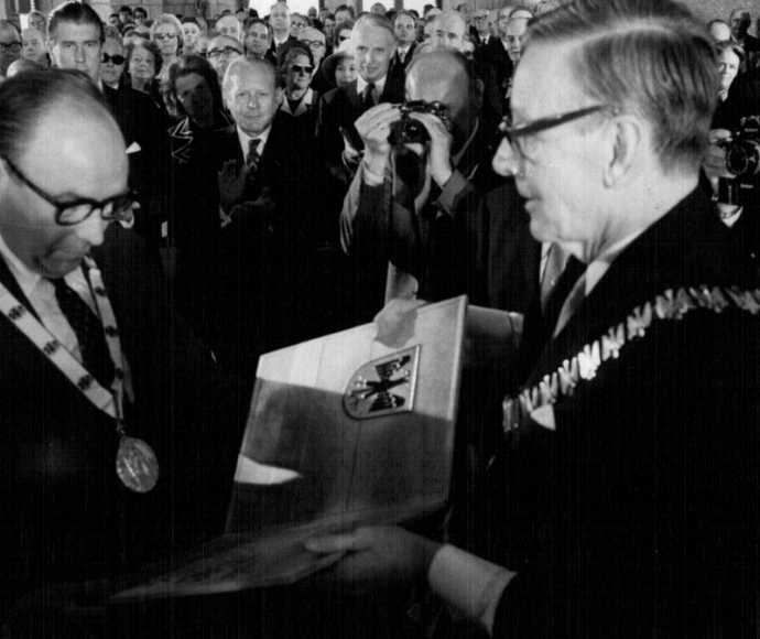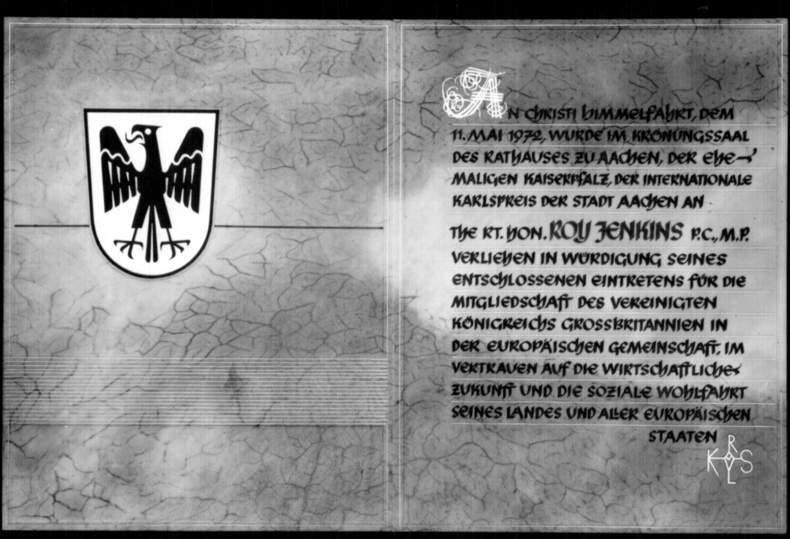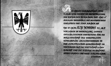 An Christi Himmelfahrt, dem 11. Mai 1972, wurde im Krönungssaal des Rathauses zu Aachen, der ehemaligen Kaiserpfalz, derInternationale Karlspreis der Stadt Aachen an The Rt. Hon. Roy Jenkins P.C.M.P. verliehen in Würdigung seines entschlossenen Eintretens für die Mitgliedschaft des VereinigtenKönigreichs Großbritannien in derEuropäischen Gemeinschaft, im Vertrauen auf die wirtschaftliche Zukunft und die soziale Wohlfahrt seines Landes und aller europäischen Staaten.