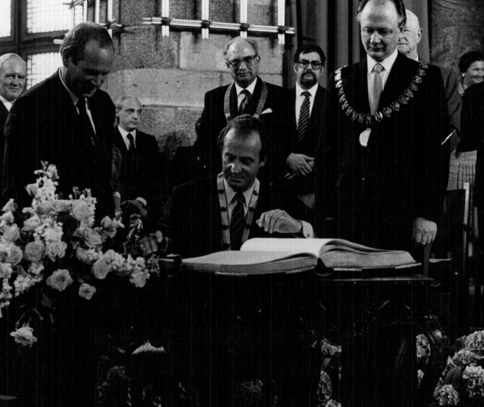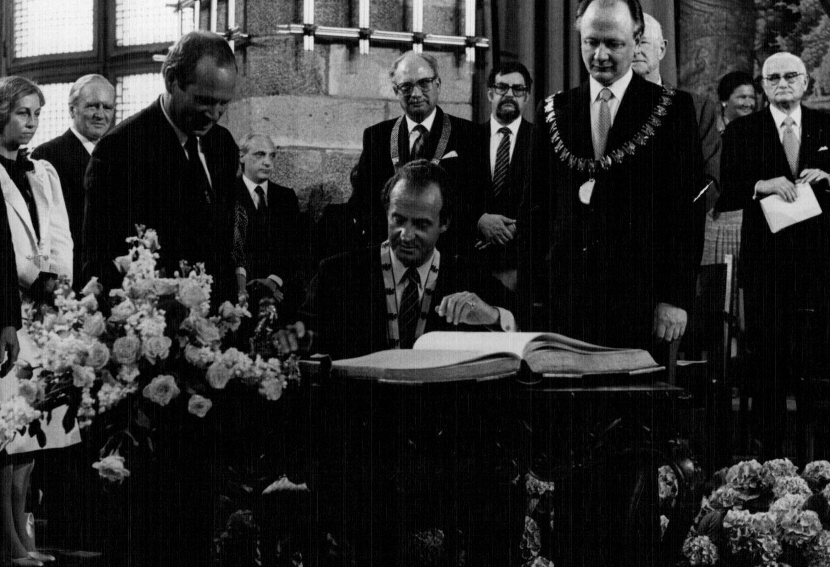 Am Himmelfahrtstag, dem 20. Mai 1982, wurde im Krönungssaal des Aachener Rathauses, der ehemaligen Kaiserpfalz, der Internationale Karlspreis für das Jahr 1982 an Seine Majestät König Juan Carlos I verliehen in Würdigung seines entschiedenen Wirkens um ein in Gemeinschaft mit Spanien geeintes Europa und sein kraftvolles und mutiges Eintreten für die den Kontinent tragenden Prinzipien der Gerechtigkeit und Freiheit.