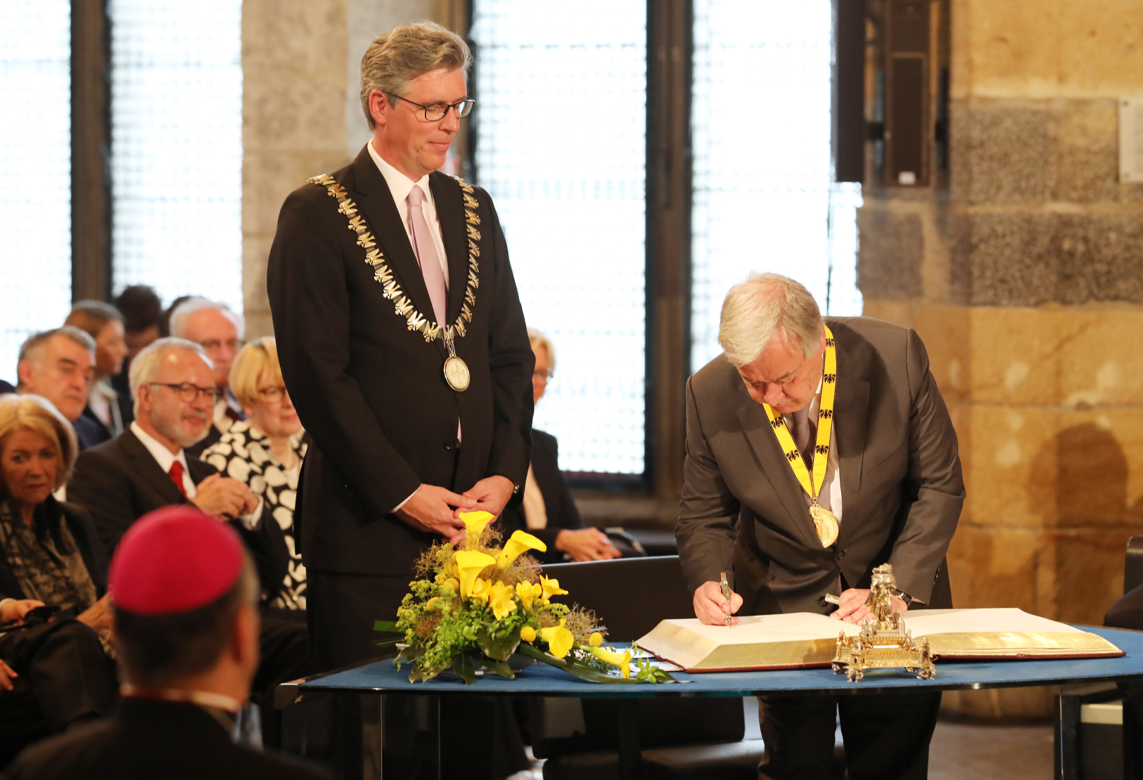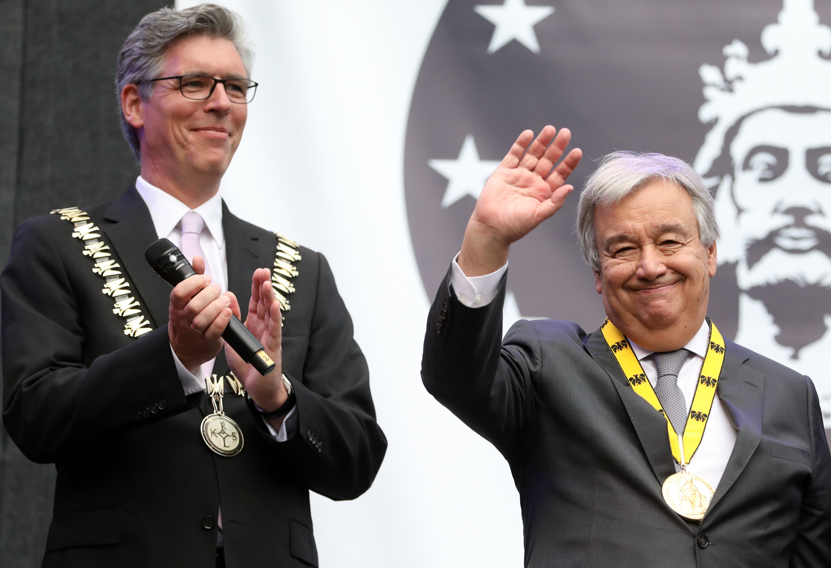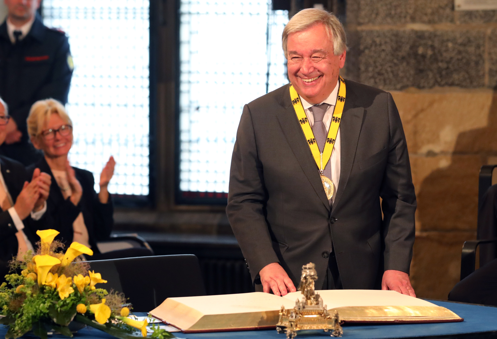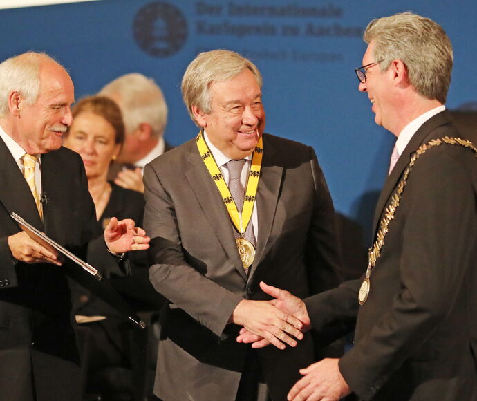 À une époque où les droits universels sont de plus en plus bafoués et où les principes démocratiques sont mis à mal, le comité directeur de la Société pour le Prix international Charlemagne d'Aix-la-Chapelle rend hommage au secrétaire général des Nations unies, António Guterres, éminent défenseur du modèle social européen, du pluralisme, de la tolérance et du dialogue, de sociétés ouvertes et solidaires, du renforcement et de la consolidation de la coopération multilatérale et d'une communauté internationale capable de relever efficacement les défis existentiels du XXIe siècle, en particulier l'équilibre entre le Nord et le Sud et la protection de nos ressources naturelles.