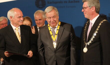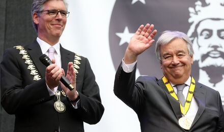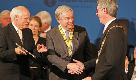 Le comité directeur de la Société pour l'attribution du Prix Charlemagne d'Aix-la-Chapelle encourage toutefois le secrétaire général des Nations unies, Antonio Guterres, pour son engagement significatif et lui décerne le Prix international Charlemagne d'Aix-la-Chapelle 2019 en reconnaissance de ses efforts pour relancer et consolider la coopération multilatérale sur la base des valeurs et des objectifs de l'Union européenne et des Nations unies.