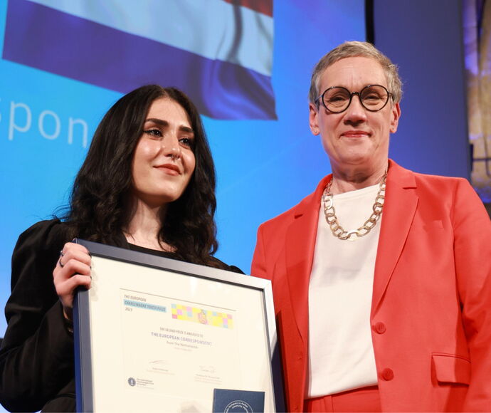 Zwei Projekte belegen gemeinsam den zweiten Platz: Das „Mobile Klimamuseum“ aus Litauen und „The European Correspondent“ aus den Niederlanden. Sie erhalten jeweils 3.750 Euro.