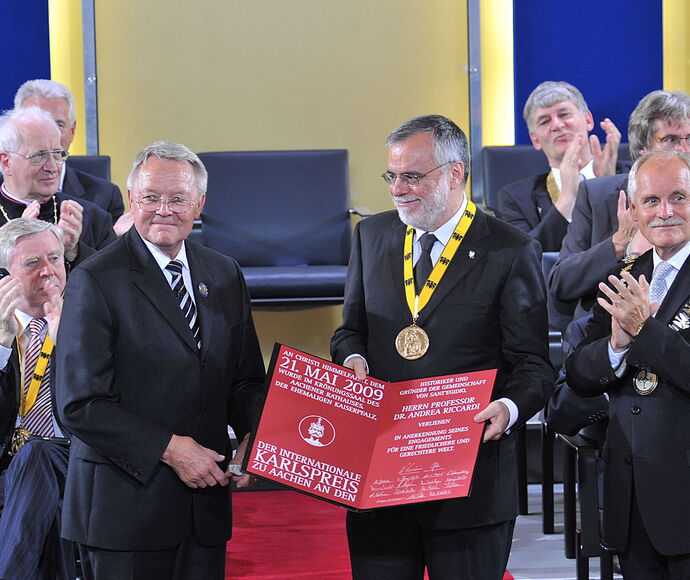 In Würdigung eines herausragenden Beispiels zivilgesellschaftlichen Engagements für ein menschliches und – innerhalb wie außerhalb seiner Grenzen – solidarisches Europa, für die Verständigung von Völkern, Kulturen und Religionen und für eine friedlichere und gerechtere Welt ehrt das Direktorium der Gesellschaft für die Verleihung des Internationalen Karlspreises zu Aachen im Jahre 2009 den italienischen Historiker und Gründer der Gemeinschaft von Sant”˜Egidio, Prof. Dr. Andrea Riccardi.