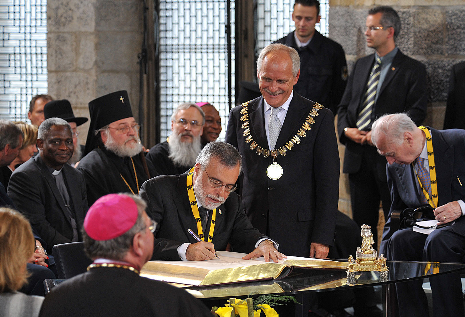 „Aachen im Herzen Europas, reich an Geschichte und schon immer Knotenpunkt der Begegnung, wird die Hauptstadt des Friedens und Symbol der alten und neuen europäischen Realität sein: Dialog und nicht Konfrontation.“ Dieser von Andrea Riccardi formulierte Leitgedanke für das 2003 in Aachen abgehaltene Weltfriedensgebet soll auch das Motiv der Karlspreisverleihung 2009 sein.