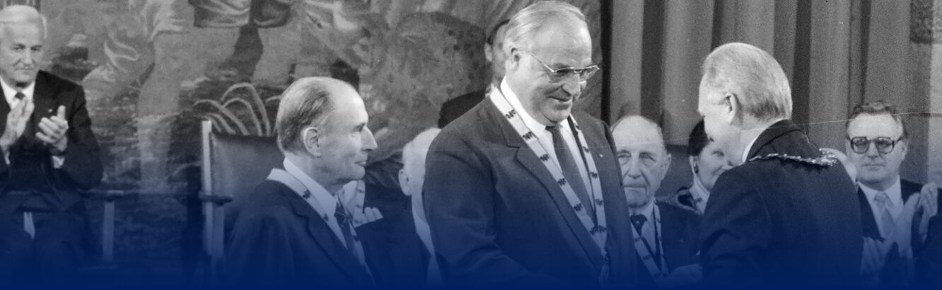 Am 1. November 1988 wurde im Krönungssaal des Aachener Rathauses, der ehemaligen Kaiserpfalz, der Internationale Karlspreis für das Jahr 1988 an den Präsidenten der Französischen Republik, Herrn François Mitterrand und den Bundeskanzler der Bundesrepublik Deutschland, Herrn Doktor Helmut Kohl, verliehen in Würdigung ihres ununterbrochenen und erfolgreichen Strebens um dauerhafte Freundschaft ihrer Länder und um Erhaltung und Festigung der Europäischen Gemeinschaft.