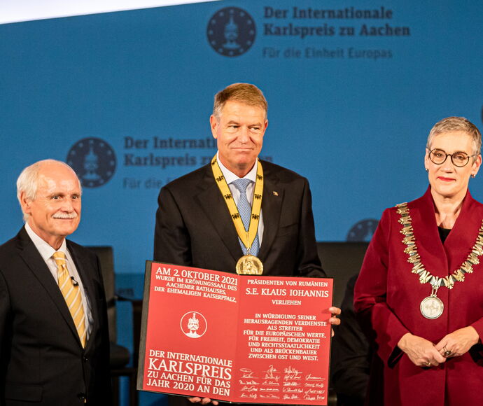 Mit dem Präsidenten von Rumänien, Klaus Johannis, ehrt das Direktorium der Gesellschaft für die Verleihung des Internationalen Karlspreises zu Aachen im Jahr 2020 einen herausragenden Streiter für die europäischen Werte, für Freiheit und Demokratie, den Schutz von Minderheiten und kulturelle Vielfalt, der sich bedeutende Verdienste um die Rechtsstaatlichkeit und die Unabhängigkeit der Justiz erworben hat – eine fundamentale Voraussetzung für eine weitere Vertiefung der Integration. Die Preisverleihung ist eine Ermutigung für Klaus Johannis, seinen europäischen Weg entschlossen weiterzugehen; eine Ermutigung für uns alle, die europäische Idee voranzutreiben und zu leben.