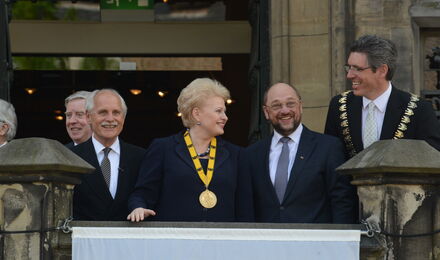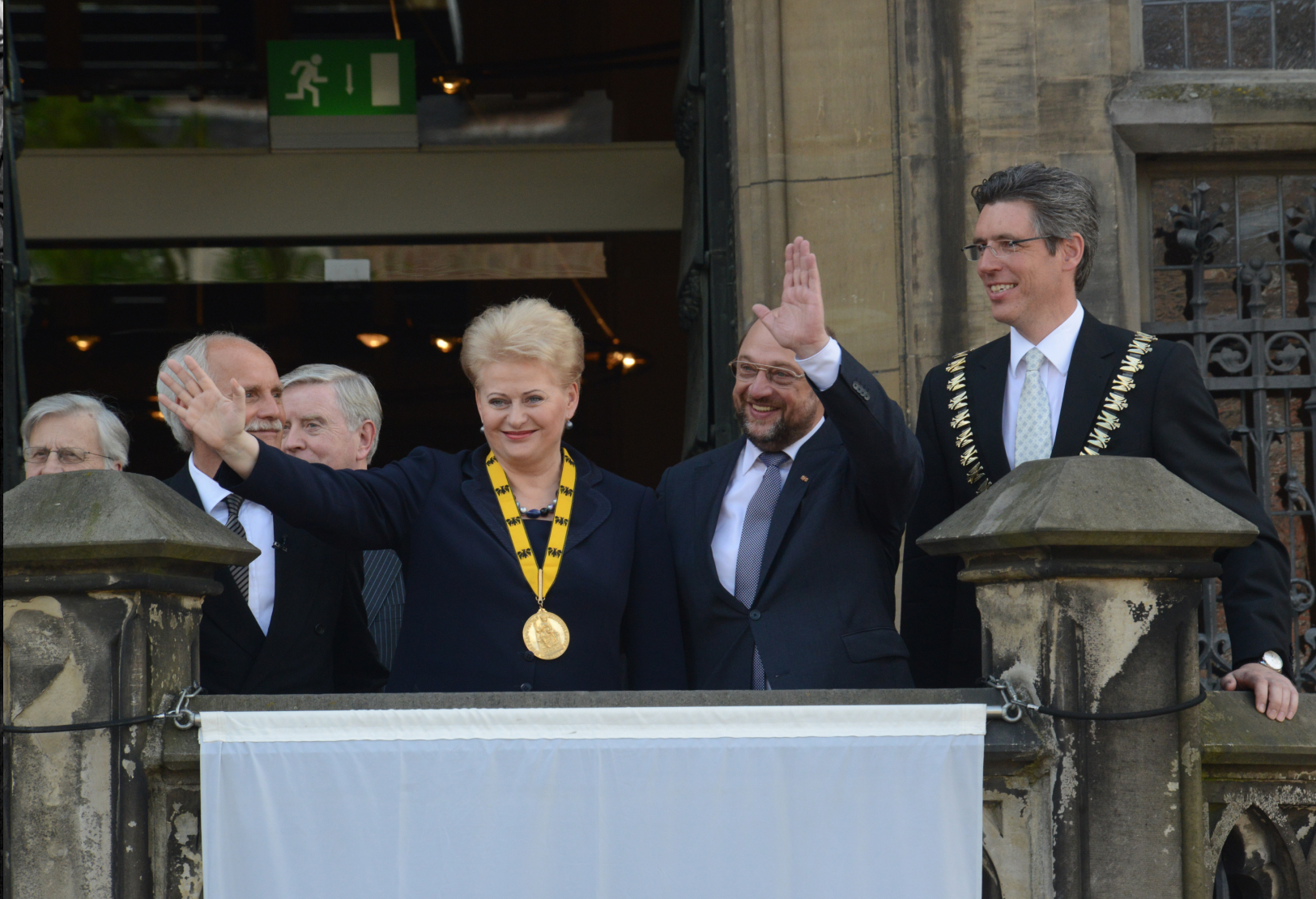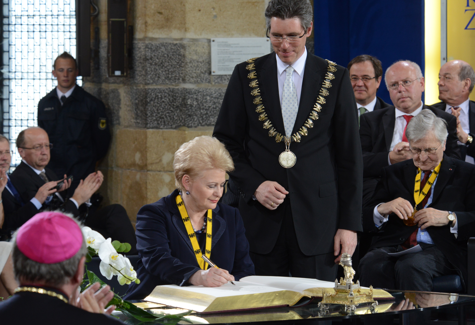 These days, it is worth turning our attention to the northeast of the European Union, where impressive proof is being provided of how even profound crises can be overcome with a clear strategy, great discipline and a willingness to make sacrifices. In recognition of her significant personal services to European integration and the exemplary development of her country, the Board of Directors of the Society for the Conferring of the International Charlemagne Prize of Aachen honours Dr Dalia Grybauskaitė, President of the Republic of Lithuania, in the year 2013.