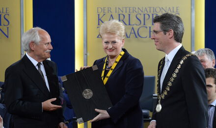 In 2013, the Board of Directors of the Society for the Conferring of the International Charlemagne Prize of Aachen is honouring one of the outstanding personalities of the Baltic region in recognition of her significant contribution to the deepening integration of the European Union and the management of the current crisis: Dr Dalia Grybauskaitė, President of the Republic of Lithuania.