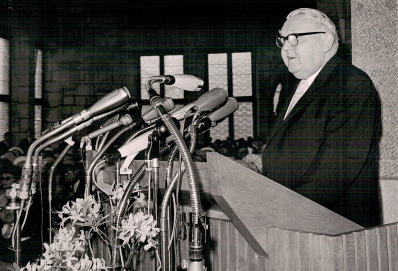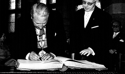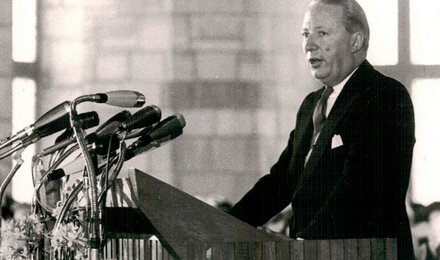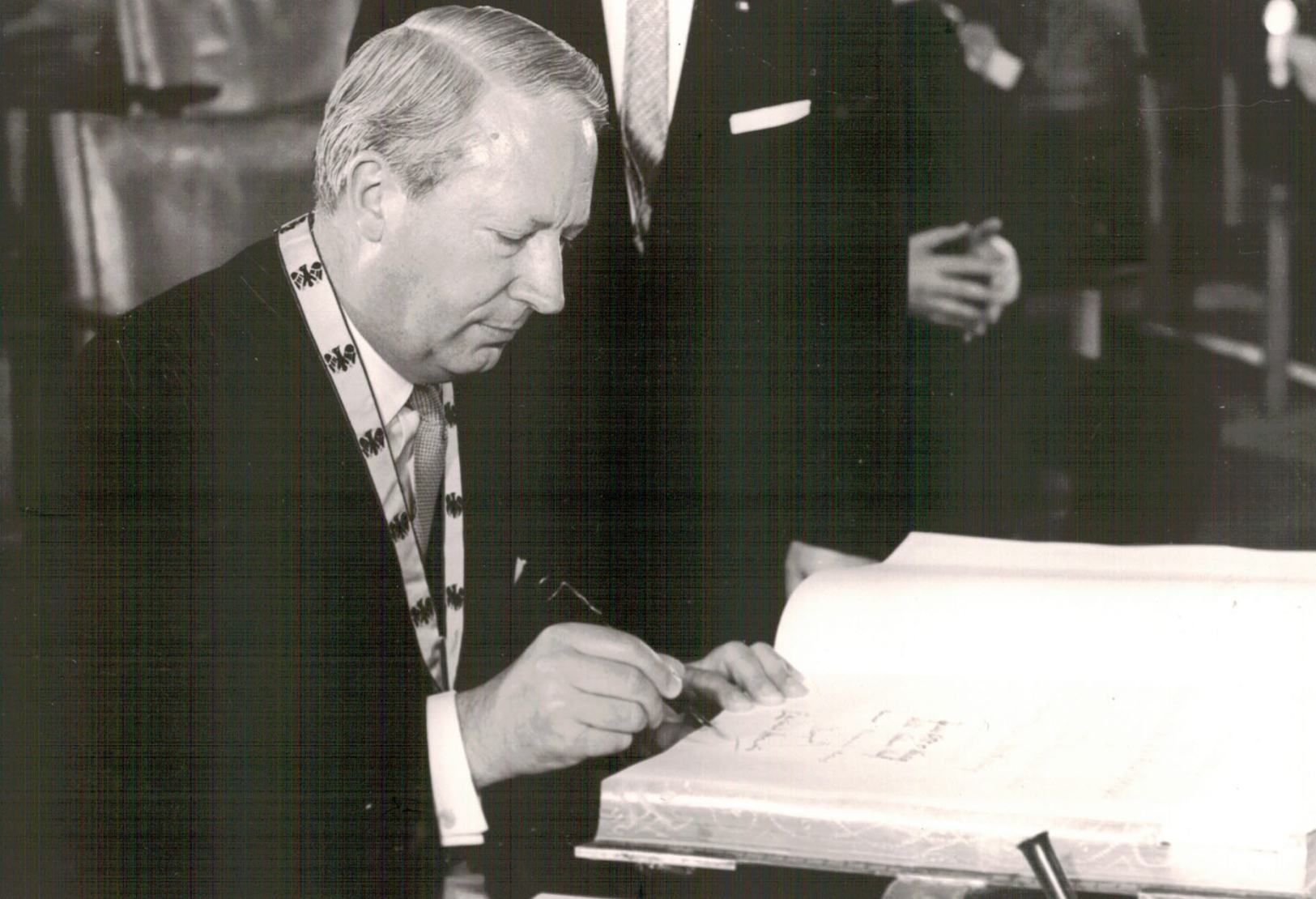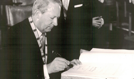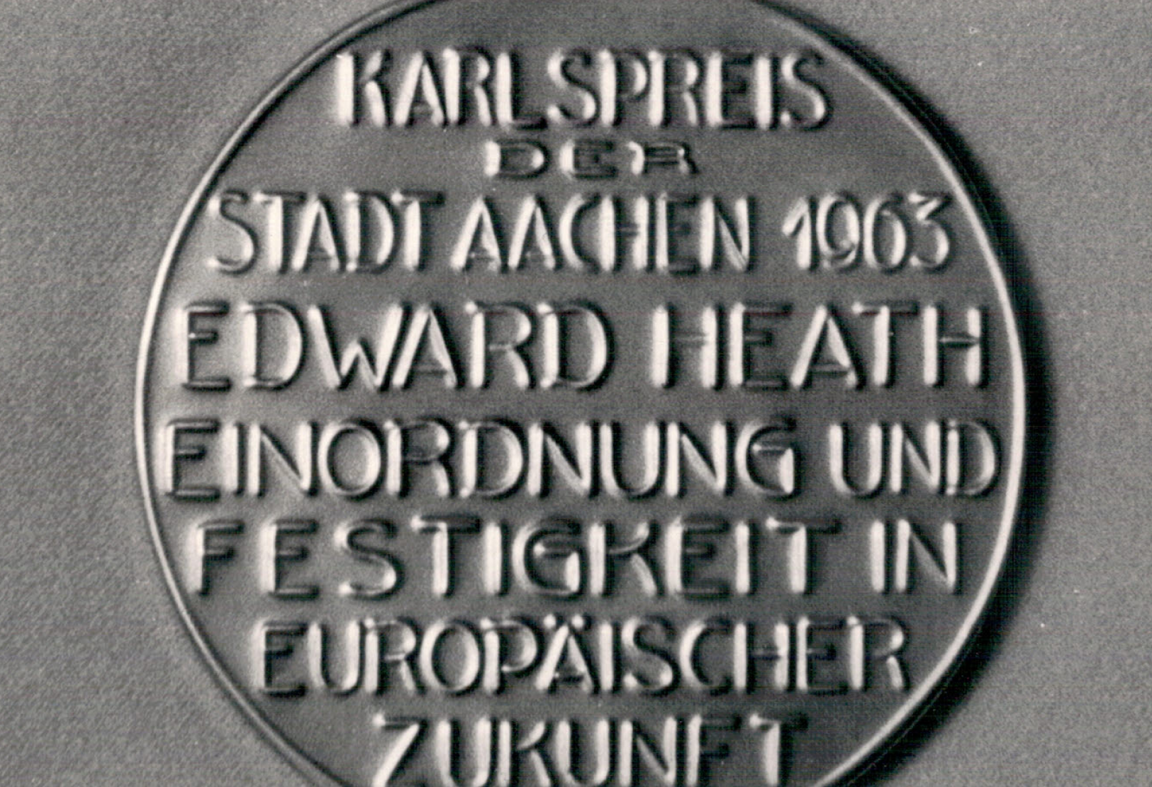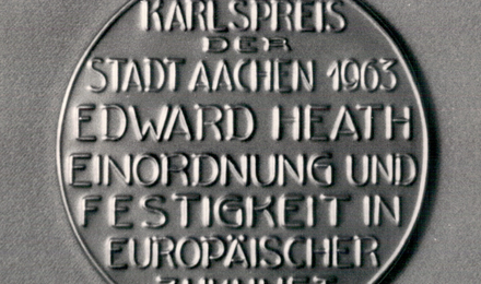 On Ascension Day, 23 May 1963, in the Coronation Hall of the Town Hall, the former Imperial Palace, the City of Aachen's International Charlemagne Prize for the year 1963 was awarded to the British Lord Privy Seal The Rt. Hon. Edward Heath PC, M.B.E. M.P. in recognition of his unstinting efforts to integrate Great Britain into the unification movement on the continent and of his commitment to the European community of destiny.
