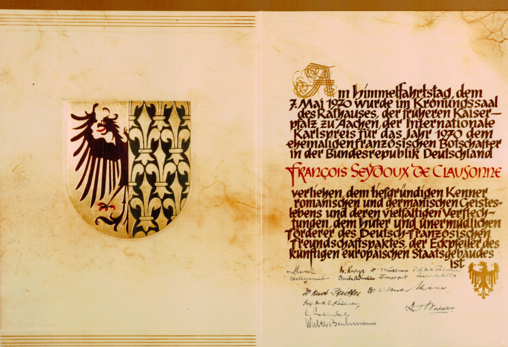 On Ascension Day, 7 May 1970, in the Coronation Hall of the Town Hall, the former imperial palace, in Aachen, the International Charlemagne Prize for the year 1970 was awarded to the former French ambassador to the Federal Republic of Germany, François Seydoux de Clausonne, the profound connoisseur of Romanesque and Germanic intellectual life and their manifold interrelations, the guardian and tireless promoter of the Franco-German friendship pact, which is the cornerstone of the future European state.
