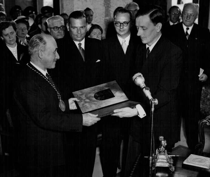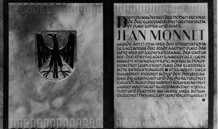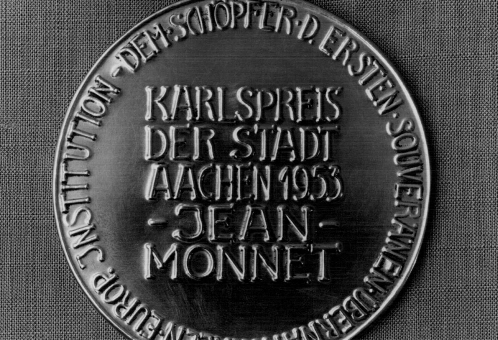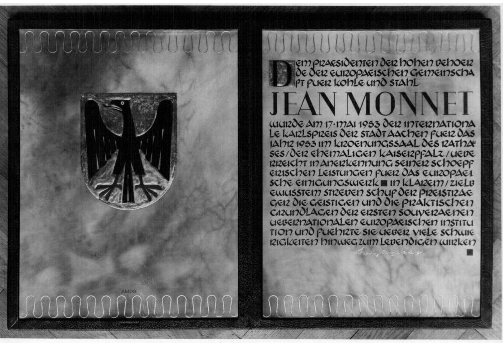 Dem Präsidenten der Hohen Behörde der Europäischen Gemeinschaft für Kohle und Stahl Jean Monnet wurde am 17. Mai 1953 der Internationale Karlspreis der Stadt Aachen für das Jahr 1953 im Krönungssaal des Rathauses, der ehemaligen Kaiserpfalz, überreicht in Anerkennung seiner schöpferischen Leistungen für das europäische Einigungswerk. In klarem zielbewußtem Streben schuf der Preisträger die geistigen und die praktischen Grundlagen der ersten souveränen übernationalen europäischen Institution und führte sie über viele Schwierigkeiten hinweg zum lebendigen Wirken.