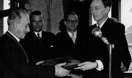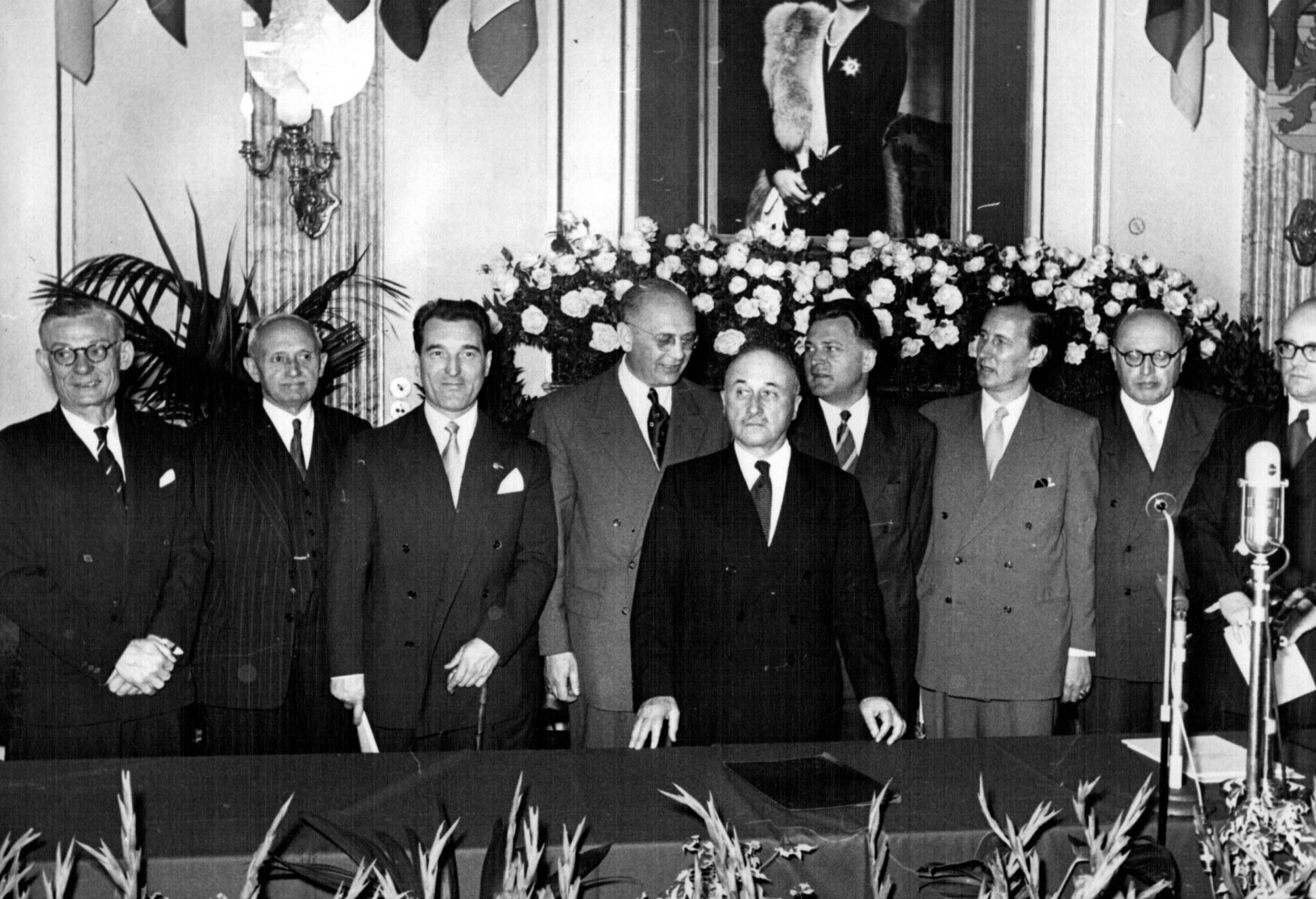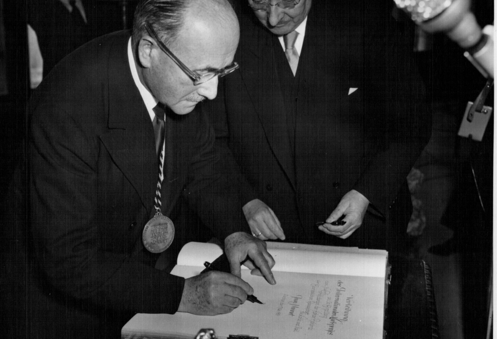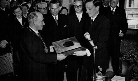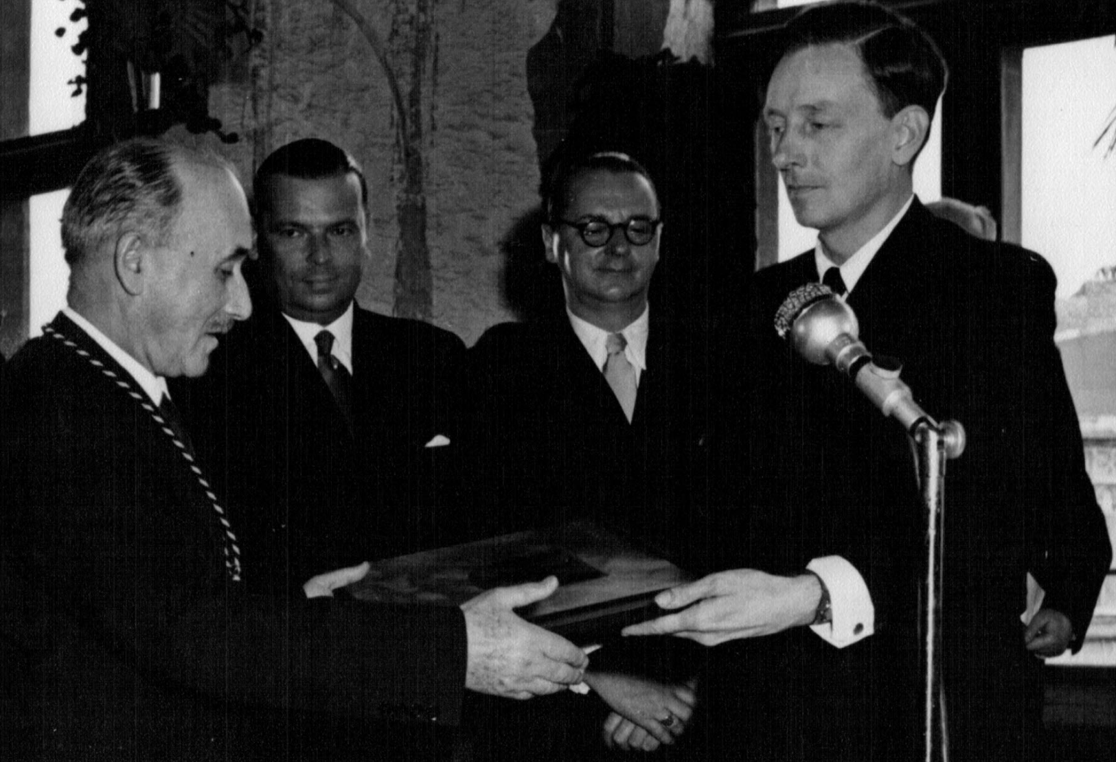Dem Präsidenten der Hohen Behörde der Europäischen Gemeinschaft für Kohle und Stahl Jean Monnet wurde am 17. Mai 1953 der Internationale Karlspreis der Stadt Aachen für das Jahr 1953 im Krönungssaal des Rathauses, der ehemaligen Kaiserpfalz, überreicht in Anerkennung seiner schöpferischen Leistungen für das europäische Einigungswerk. In klarem zielbewußtem Streben schuf der Preisträger die geistigen und die praktischen Grundlagen der ersten souveränen übernationalen europäischen Institution und führte sie über viele Schwierigkeiten hinweg zum lebendigen Wirken.