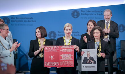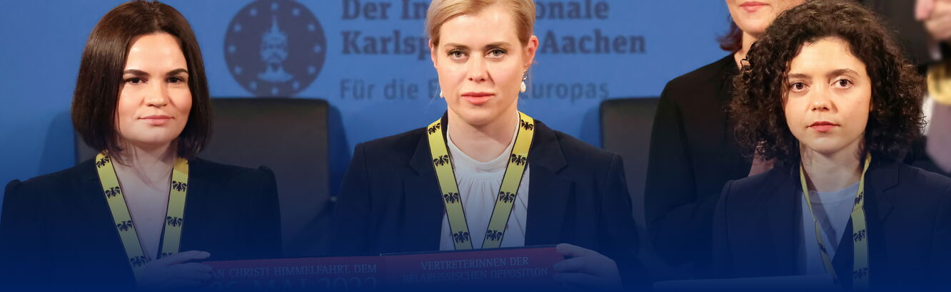In recognition of their courageous and encouraging commitment against brutal state arbitrariness, torture, oppression and the violation of elementary human rights by an authoritarian regime, for democracy, freedom and the rule of law, the Board of Directors of the Society for the Conferring of the International Charlemagne Prize of Aachen honours the Belarusian political activists Maria Kalesnikava, Svetlana Tikhanovskaya and Veronica Tsepkalo in 2022.