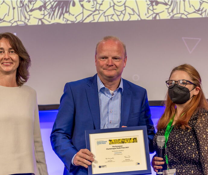 The main winner of the 2021 Youth Karlspreis competition is the Czech project Fakescape. The unique games developed by a student association teach schoolchildren to check, question and read information carefully. Through a combination of board and escape games, young people learn how fake news, disinformation and manipulation work. The members of the association visited around 200 schools in the Czech Republic, Sweden, Spain, Ukraine, Germany and even India, where they were able to teach over 15,000 pupils in more than eleven countries.