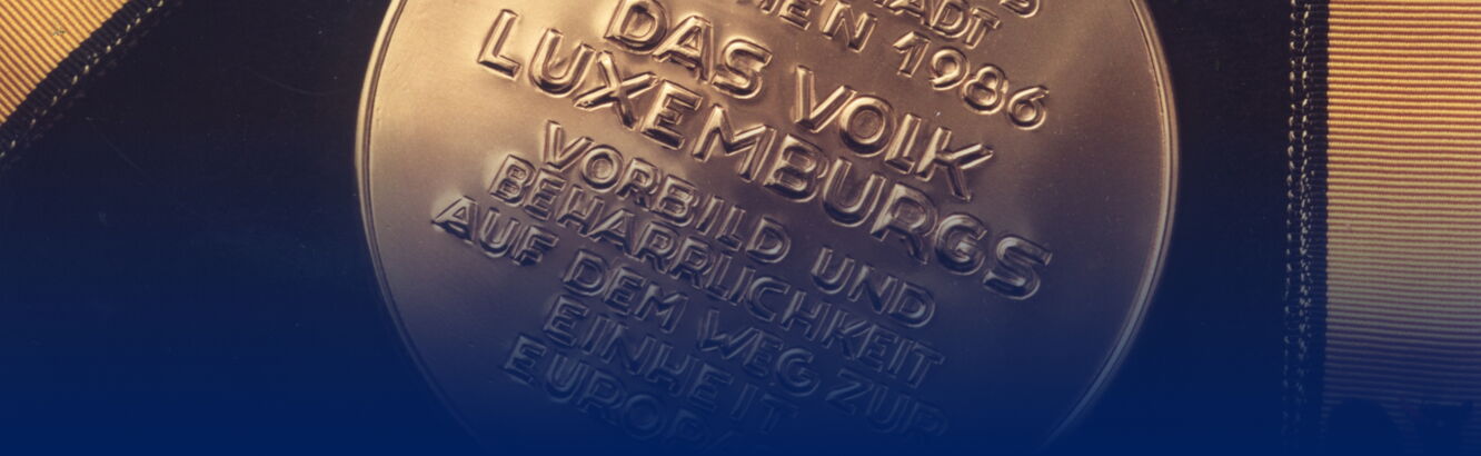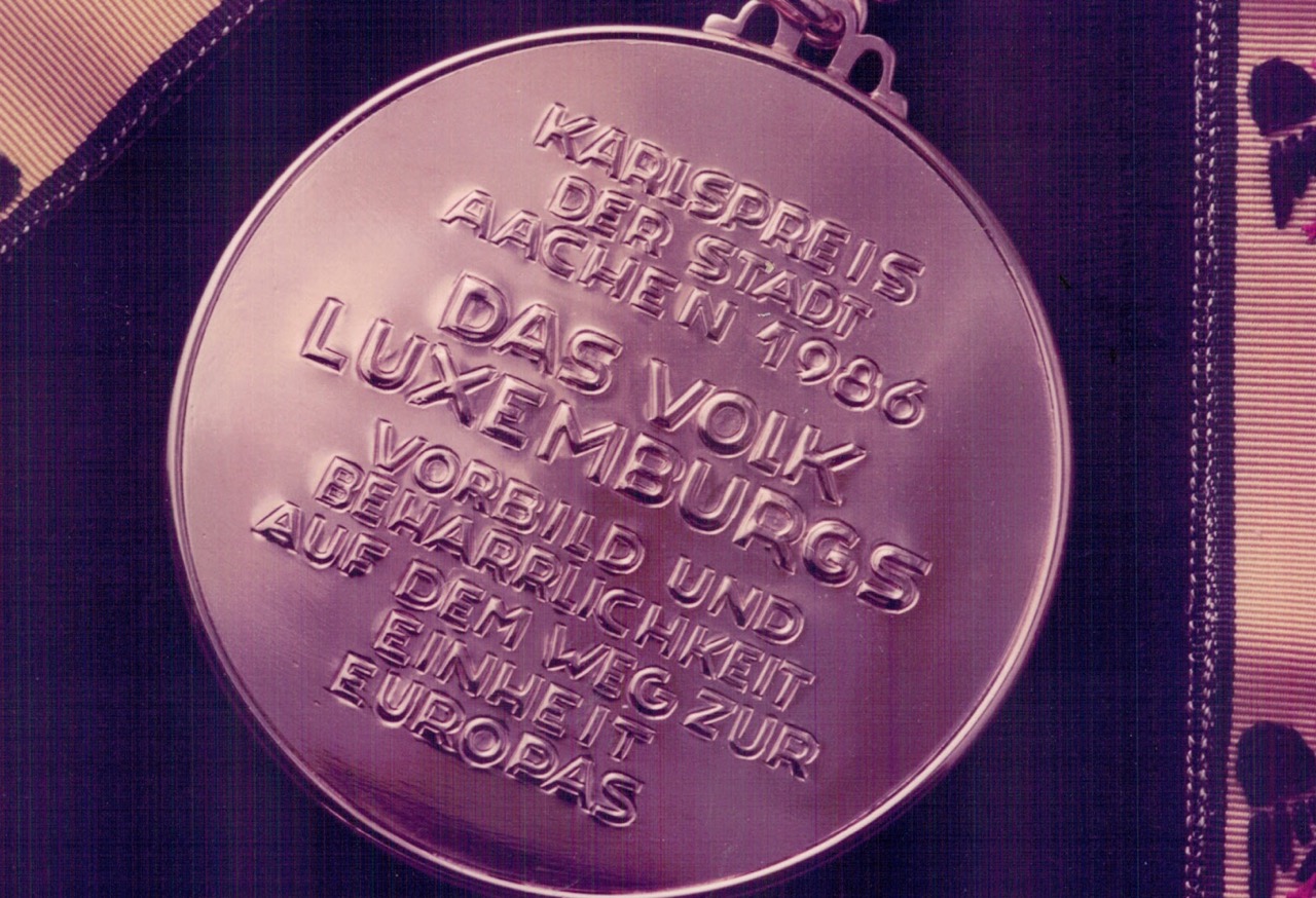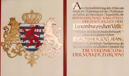 Le jour de l'Ascension, le 8 mai 1986, dans la salle du couronnement de l'hôtel de ville d'Aix-la-Chapelle, ancienne résidence impériale, le Prix international Charlemagne a été décerné au peuple luxembourgeois et remis à son chef d'État, Son Altesse Royale le Grand-Duc Jean, en reconnaissance de son engagement exemplaire et sans faille en faveur de l'union des peuples européens.