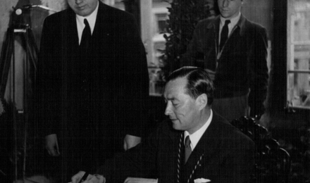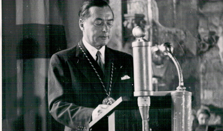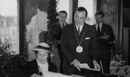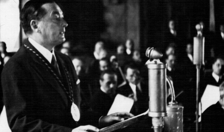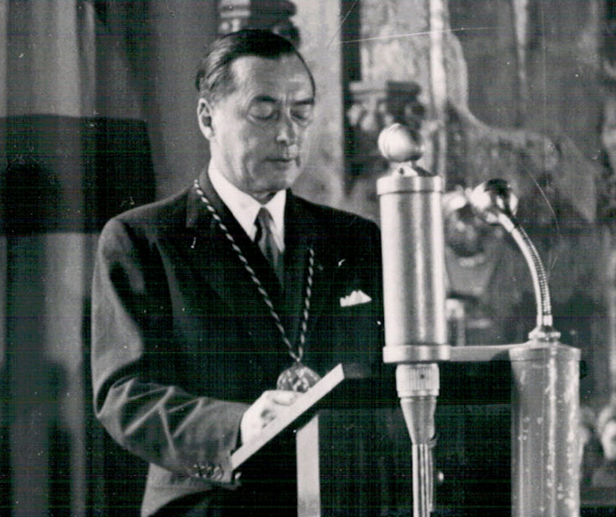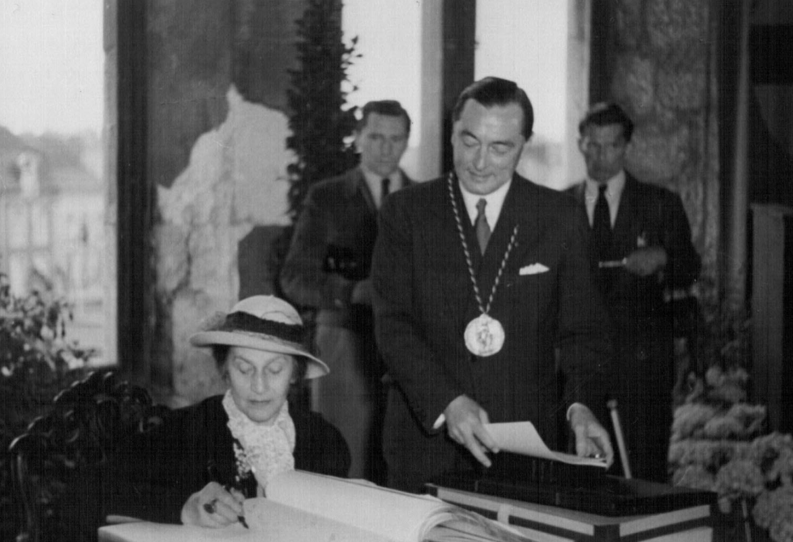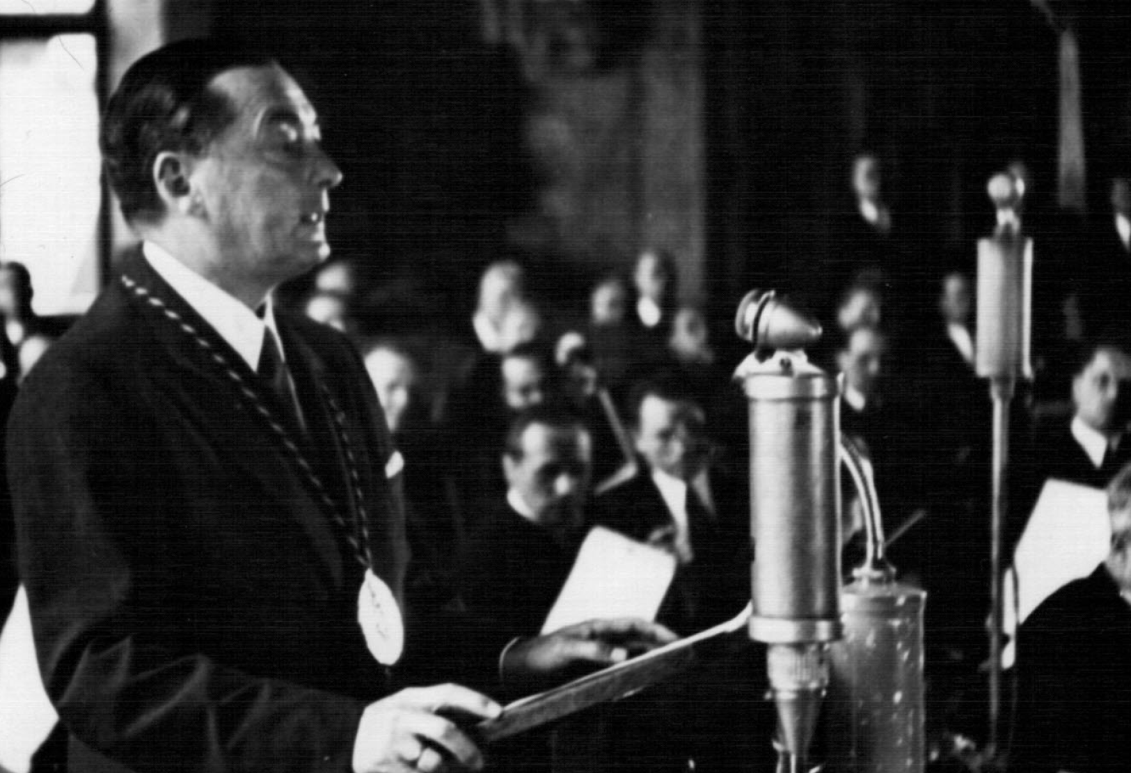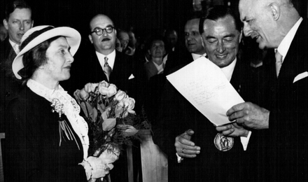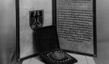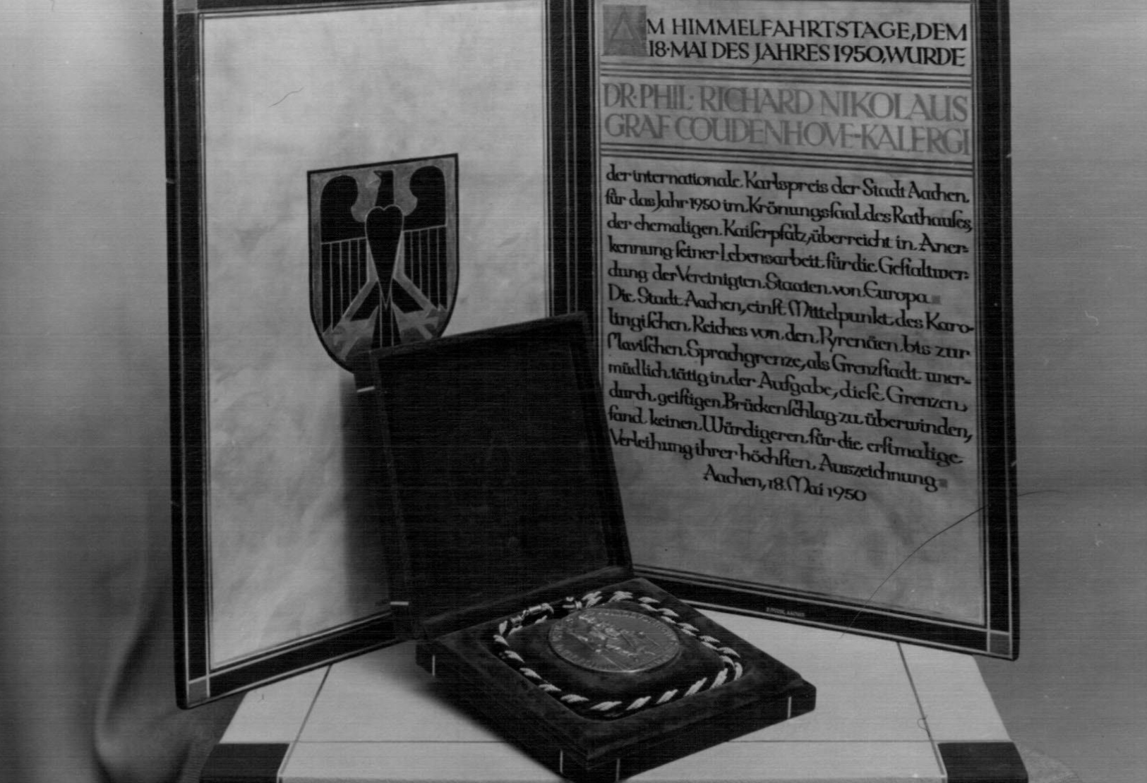Le jour de l'Ascension, le 18 mai 1950, le Dr phil. Richard Nikolaus Graf Coudenhove-Kalergi s'est vu remettre le Prix Charlemagne international de la ville d'Aix-la-Chapelle pour l'année 1950 dans la salle du couronnement de l'hôtel de ville, l'ancienne palais impérial, en reconnaissance de l'œuvre de sa vie pour la création des États-Unis d'Europe. La ville d'Aix-la-Chapelle, autrefois centre de l'empire carolingien, qui s'étendait des Pyrénées jusqu'à la frontière slave, ville frontalière qui n'a jamais cessé d'œuvrer à l'abolition de ces frontières par la construction de ponts intellectuels, n'a trouvé personne de plus digne pour recevoir la première édition de sa plus haute distinction.